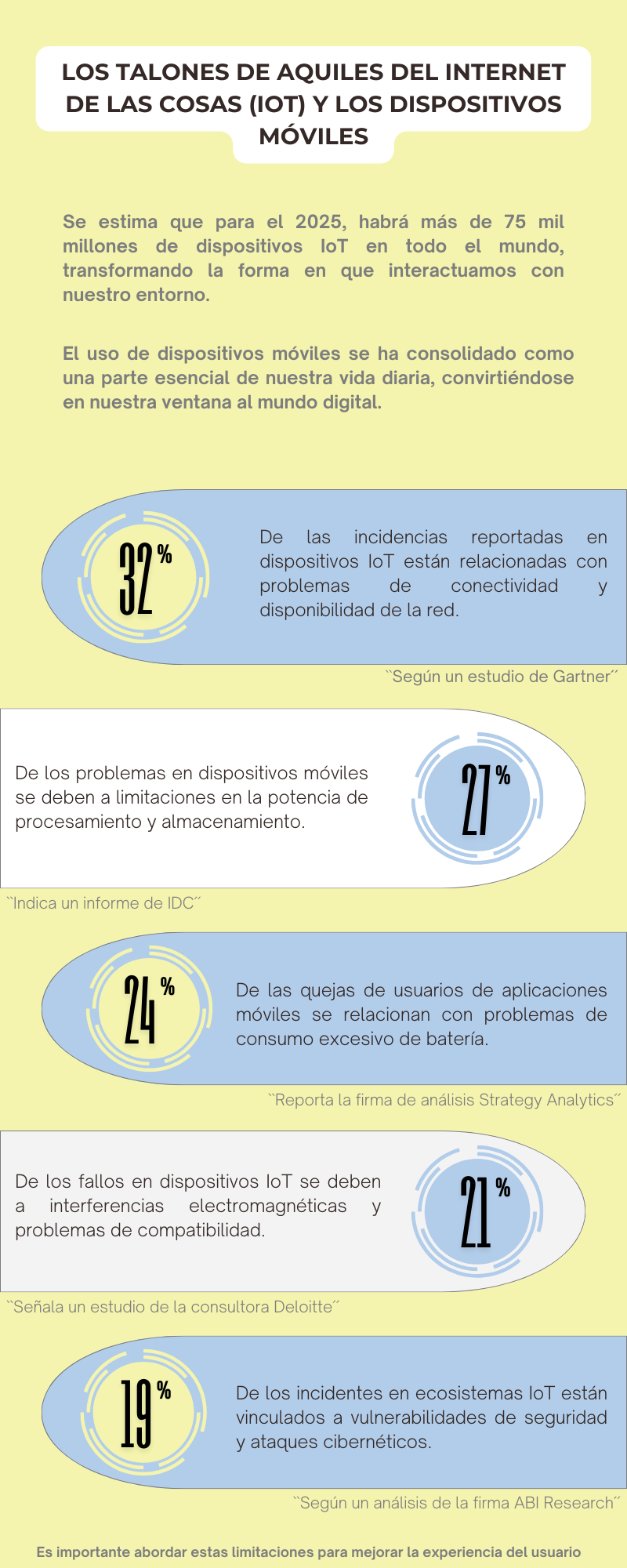 Más del 30% de las incidencias reportadas en dispositivos móviles e IoT están relacionadas con problemas de conectividad a redes Wi-Fi o móviles y alrededor del 25% de las pérdidas de señal en dispositivos móviles se deben a interferencias físicas como vegetación densa, edificios y estructuras metálicas. Los usuarios dependen de una conectividad constante para acceder a servicios en línea, realizar tareas cotidianas y comunicarse.