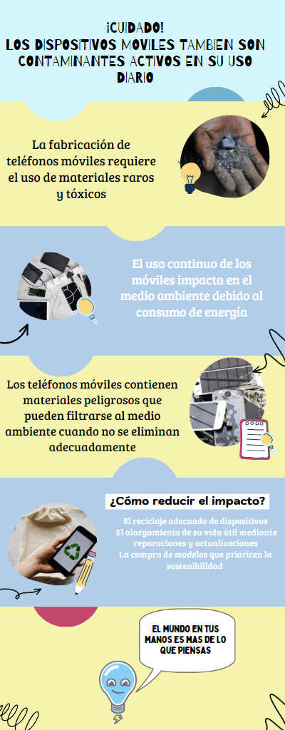 El uso de teléfonos móviles tiene un impacto significativo en el medio ambiente, principalmente debido a las etapas de extracción y producción de materiales, que generan importantes emisiones de CO2 y provocan deforestación y contaminación del suelo y del agua.