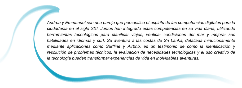 A principios de este año, decidieron emprender una aventura juntos a las exóticas costas de Sri Lanka, un destino que prometía olas impresionantes y una cultura rica. Emmanuel se encargó de planificar cada detalle del viaje utilizando las últimas herramientas tecnológicas. Andrea, que no estaba familiarizada con estas nuevas formas de organización, se sorprendió al ver cómo él manejaba todo con facilidad.